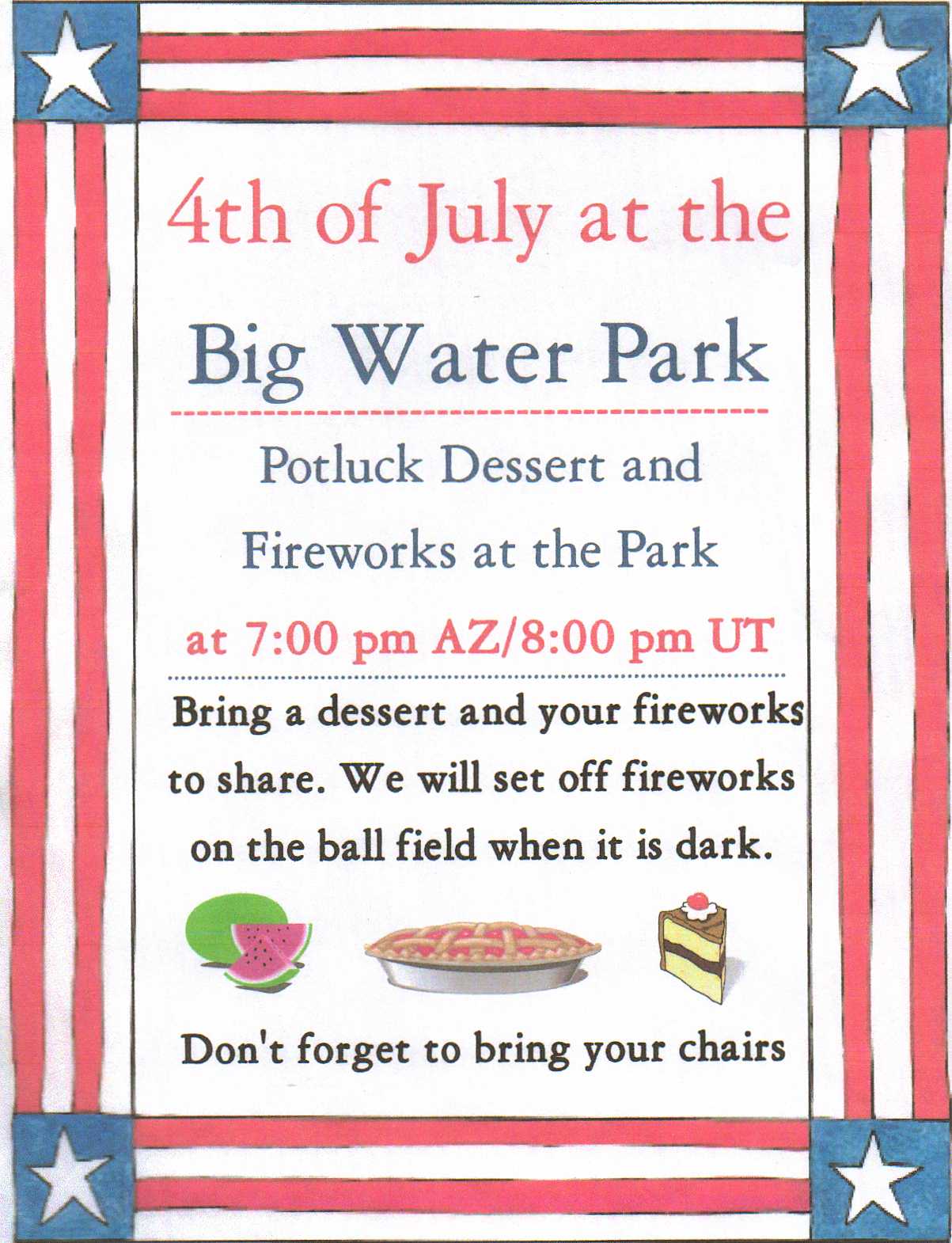 There will be a pot luck and fireworks at the new Big Water Community Park the evening of the 4th of July. Please come be part of our community celebration of Independence Day!